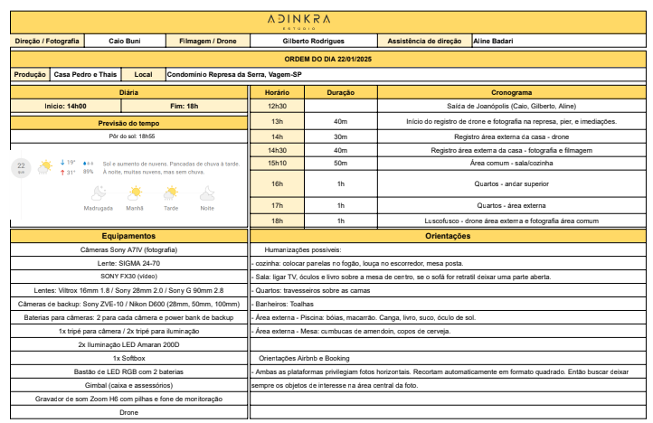 Criamos um PPM com referências de imagens, estilo de filmagem e sugestão de humanizações para alinhar com o cliente as suas necessidades, assim partimos para o planejamento da diária. Fazer a produção de objetos e a separação dos equipamentos. Montar a OD – organização hora a hora da diária para que tudo ocorra bem. Ai aquela pequena surpresa, tudo planejando para sexta, e a previsão é chuvaaaaa. Tivemos que adiantar a diária, para quarta, ai começa a correria para deixar tudo pronto.